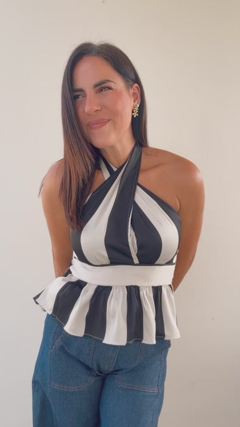 A halter-style striped peplum top featuring wide contrast vertical panels, a crossover neckline with self-tie back, and a smocked back panel for comfort. Finished with a wide waistband and a softly flared hem.