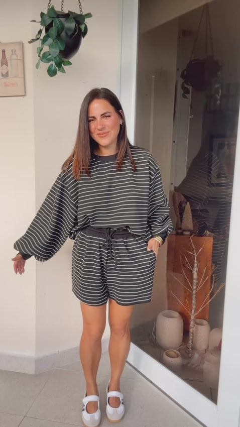 Striped 3/4 puff sleeve top and elastic waistband shorts. Wearing size Small. Runs true to size.