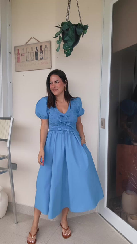Front Ribbon detail smocked short sleeve midi dress. Wearing size Small. Runs true to size.