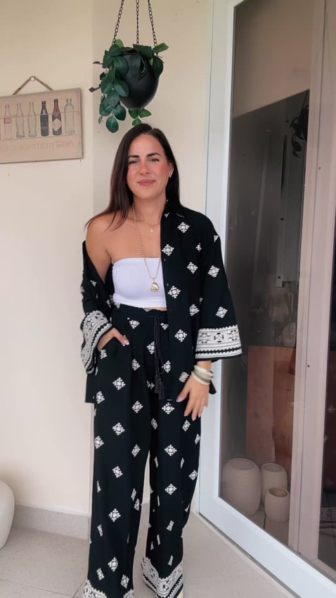 Embroidered border shirt and stretchy waistband pants. Wearing size Small.