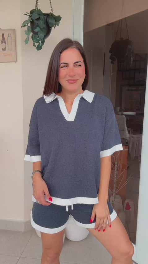 Knitted Collar Contrast Edge Short Sleeve Top and Shorts. Wearing size Small. Runs true to size.