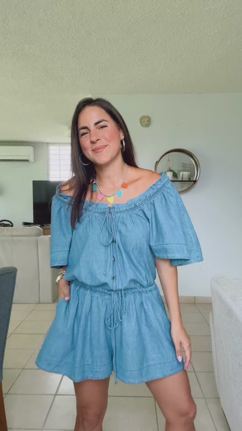 Denim butterfly sleeve loose fit flares romper with adjustable drawstring.