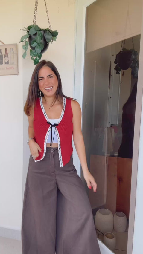 This ribbed knit tank features contrast scalloped lace edges, a velvet bow tie front closure, a curved hem, and a cropped length for a sweet, vintage-inspired silhouette.