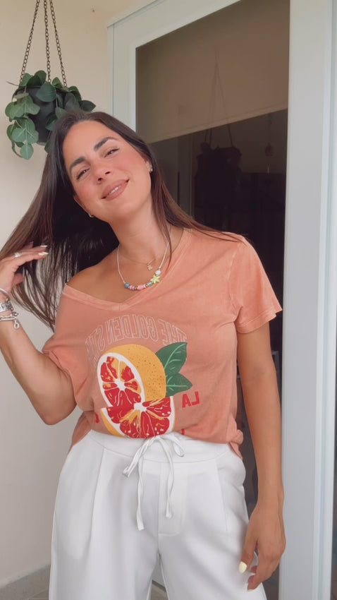 A mineral washed graphic t-shirt with the following features: Vintage-style sliced orange graphic print with "The Golden State LA CA California" text print. V neckline. Short sleeves. Relaxed fit.ย