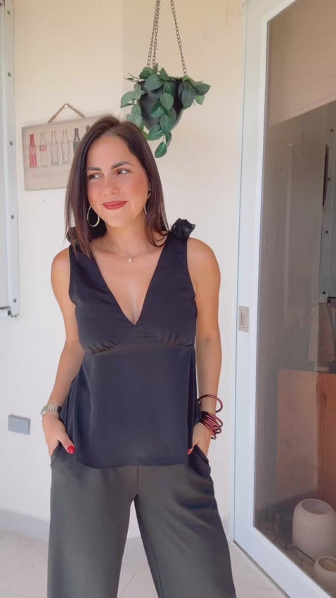 A sleeveless V-neck top featuring a sequin rosette appliqués on the shoulders. Finished with a soft flare hem for a flattering silhouette. Wearing size Small. Corre a la talla.