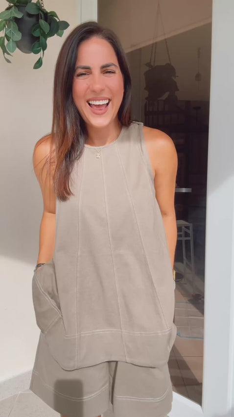 CONTRAST COLOR STITCH SLEEVELESS TOP AND SHORT PANTS SET.