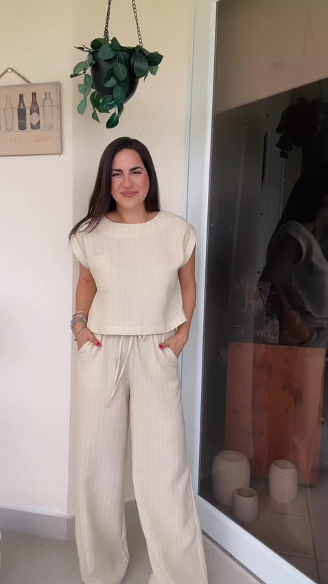 Back Button detail extended sleeve top & elastic waist pants set.