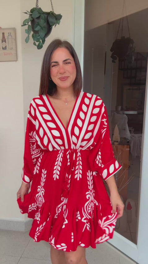 3/4 Dolman sleeve tie waist with tassel trim detail dress. Wearing size Small.