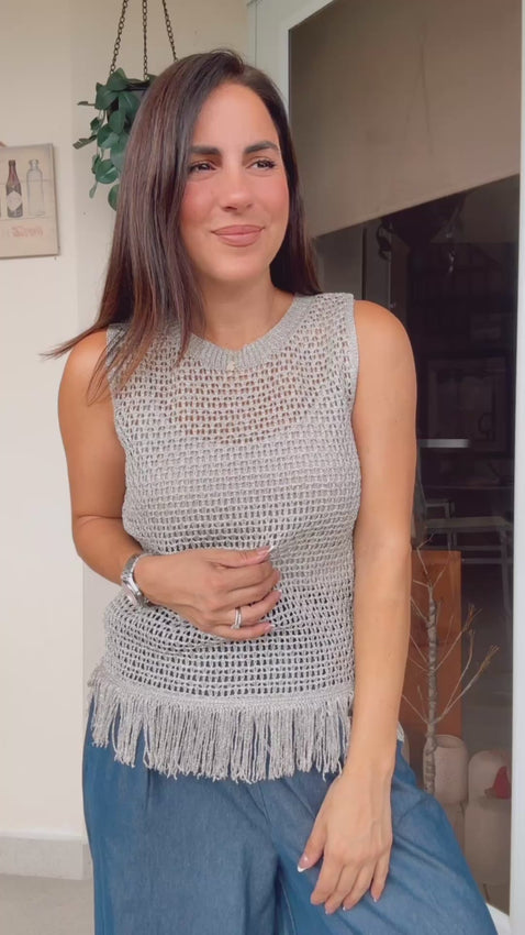 This knit tank top brings effortless style with playful fringe detailing along the hem. Its relaxed fit and soft texture make it perfect for layering or wearing alone, adding a touch of free-spirited charm to your warm-weather wardrobe.